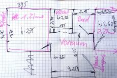 - Ein Zimmer als Hauseingangsbereich, von dem 2 Zimmer (rechts und links), 1 Küche und ein Bad (mittig) zu erreichen sind. Gesamt ca. 60 qm (ohne Waschküche mit ca. 9 qm).